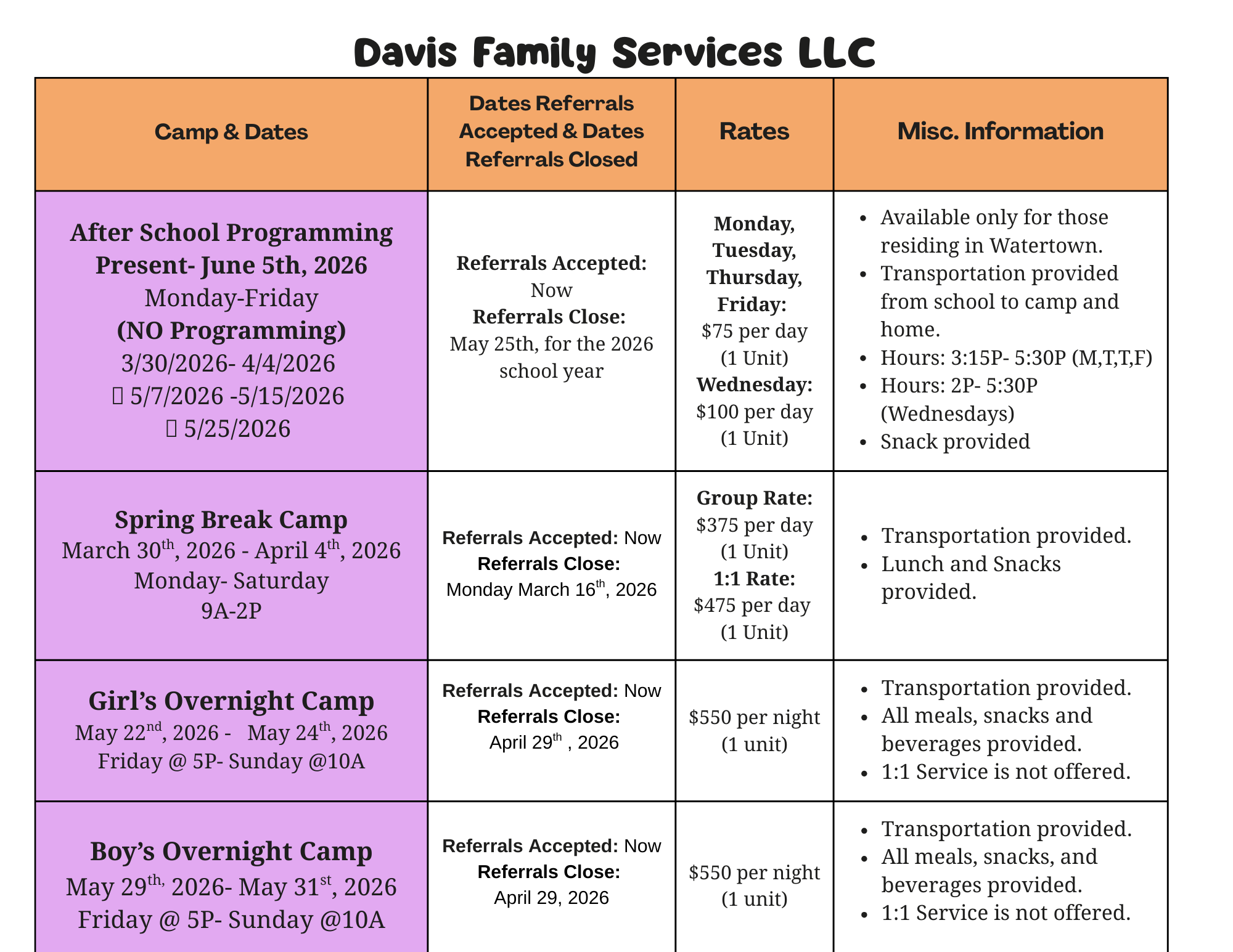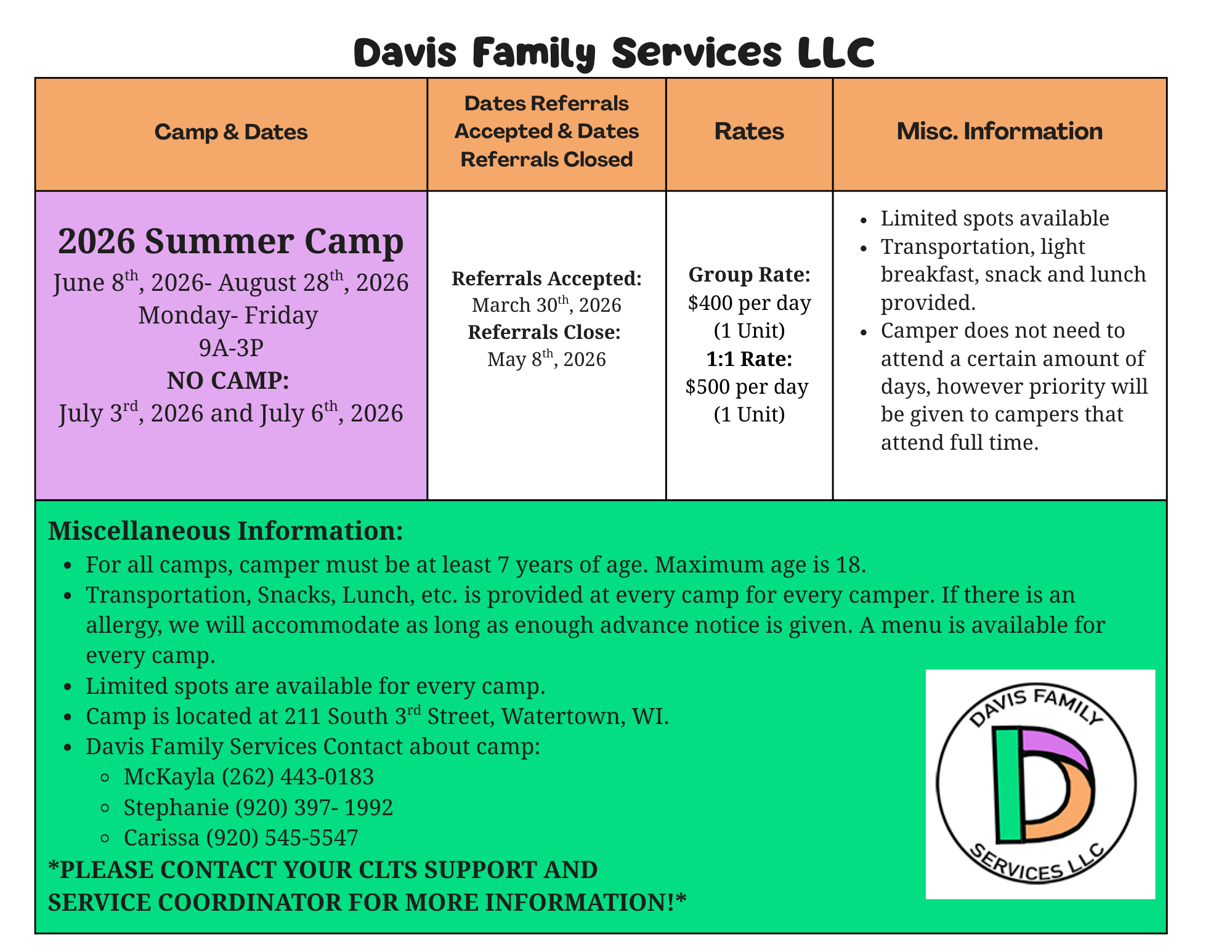 Respite camps are a great way for kids to have fun, make new friends, and enjoy exciting activities, such as—arts, games, hikes, team challenges that are led by caring professional staff. For children enrolled in the CLTS program, families and caregivers, camps offer essential respite, knowing children are supported in a warm, affirming structured setting. Many camps are offered through-out the year!